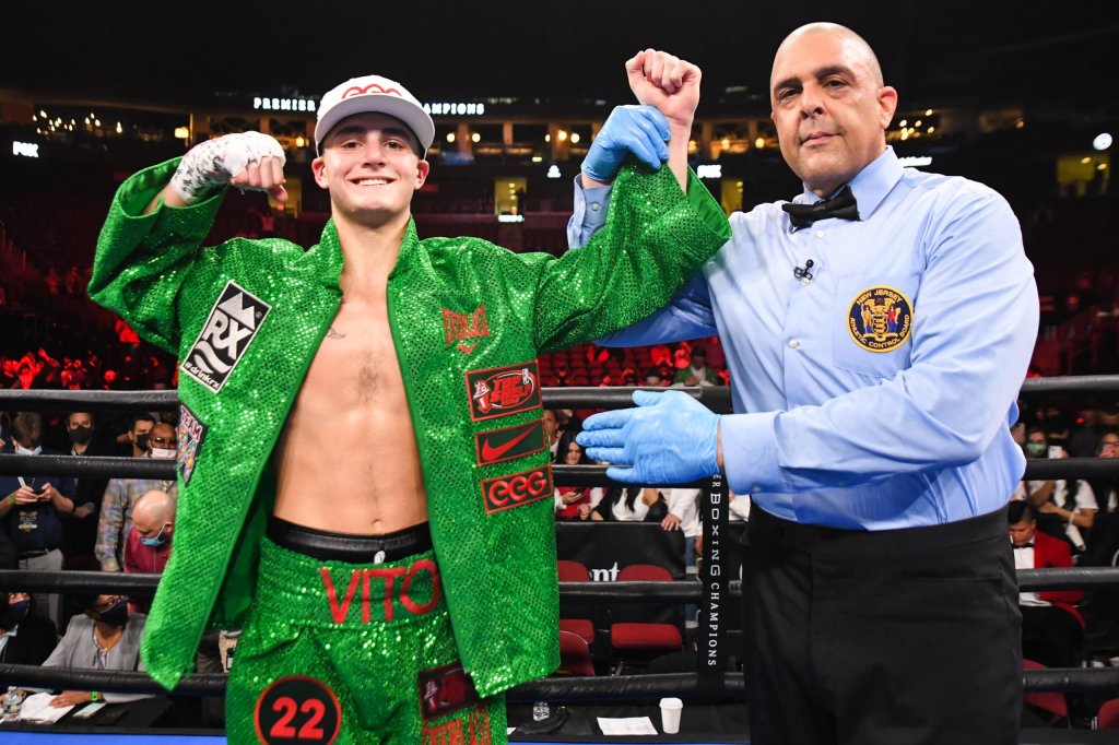 With the New Jersey Devils season put on hold boxing headlined the The Rock in Newark, New Jersey Christmas night. Roseland, New Jersey’s own Vito Mielnicki fought his first main event and reached the tenth round for the first time in his career in his tenth career victory. At age nineteen and standing six feet tall the young welterweight continues to develop in a pro career that began at age seventeen in 2019. He suffered a setback in April when he lost a decision to James Martin and in an attempt to avenge the loss Martin missed weight and the fight did not go ahead as planned. Premier Boxing Champions on Fox gave Mielnicki a shot to get serious exposure on the back of their All Madden Documentary and NFL match up between the Green Bay Packers and Cleveland Browns. Mielnicki was in total control of the fight from the opening bell until the moment referee Eric Dali waved off the fight at a minute and forty nine seconds of the tenth round.