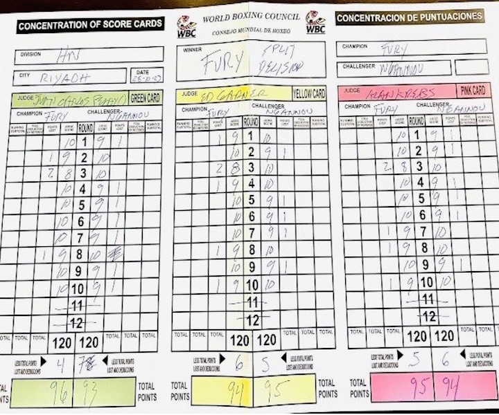 Pelayon had the fight scored the widest in favor of Fury at 96-93. We disagreed on round 2, 7 and 10. Garner was the judge who gave it to Ngannou giving him the first round which I strongly disagree with, gave Ngannou the 4th and surprisingly gave Fury round 7. Krebs and I scored the fight identically at 95-94 awarding the same rounds.